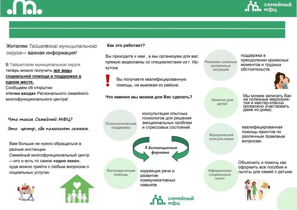 Приходите в «точку входа» Семейного МФЦ в г.Тайшете. Мы рядом, чтобы помочь вам разобраться в вопросах и получить необходимую помощь быстро и без лишних поездок.